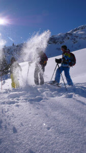 Inhalte / Die Workshops werden in eigenen Kleingruppen mit den Kindern durchgeführt. Begleitpersonen können inzwischen selbst auf Tour gehen oder falls gewünscht einen unserer Bergführer buchen. Mittags treffen sich die Gruppen auf der Hütte für eine kleine Pause und Stärkung (auf eigene Kosten). Am späten Nachmittag enden die Workshops am Ausgangspunkt. Es besteht die Möglichkeit, Bindungsadapter, LVS Geräte, etc. auszuprobieren und so ordentlich ausgerüstet erste Tourenversuche zu machen.