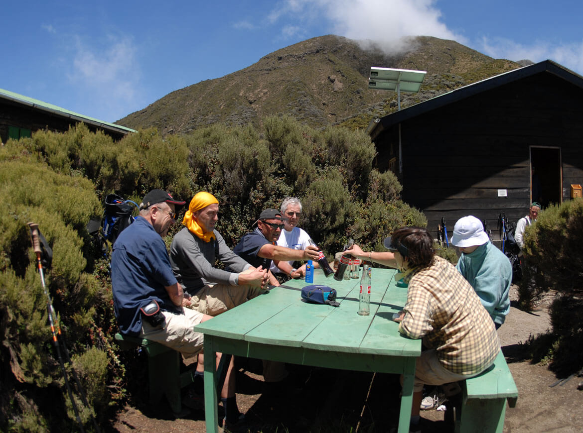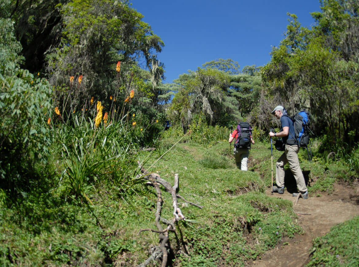 Tag 3: Nach dem Frühstück fahren wir zum Momela Gate, wo unser Aufstieg zur Miriakamba Hütte (2500 M) beginnt. Durch den tropischen Regenwald erreichen wir die Hütte in knapp 5 stunden. 1200 HM
