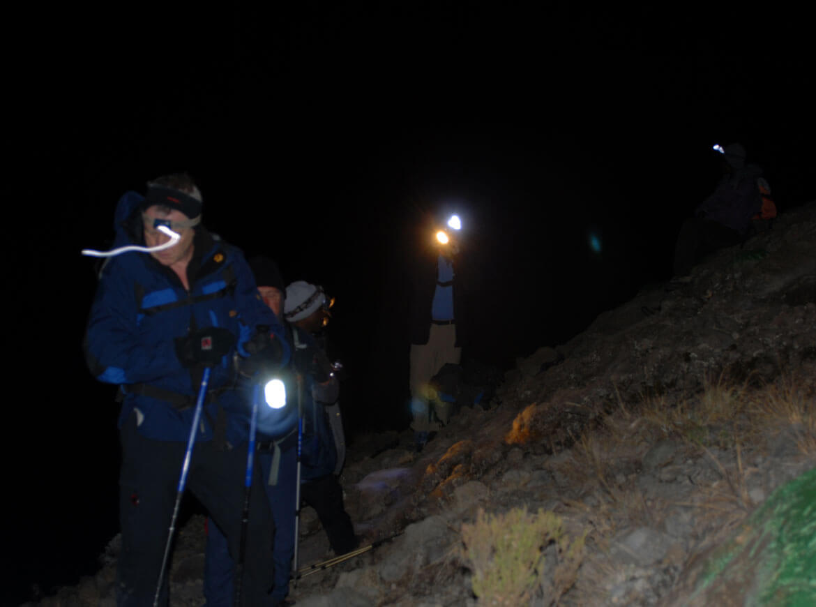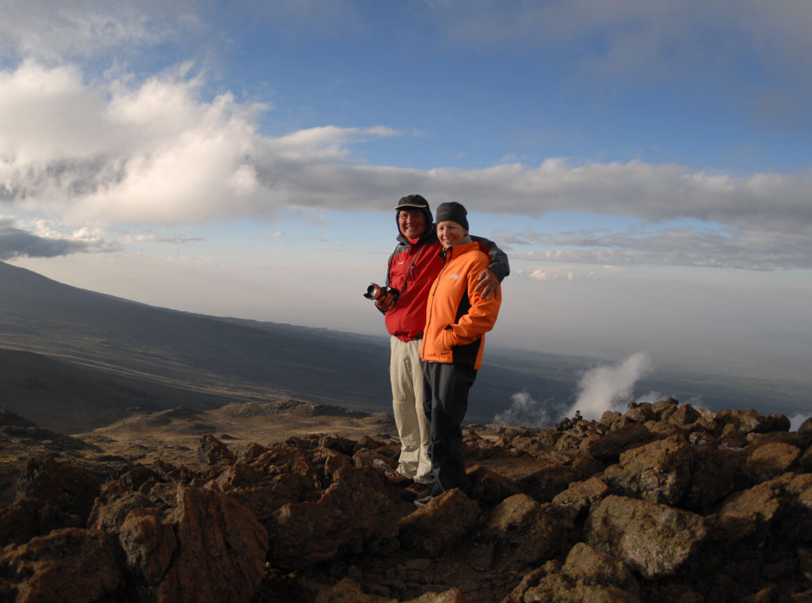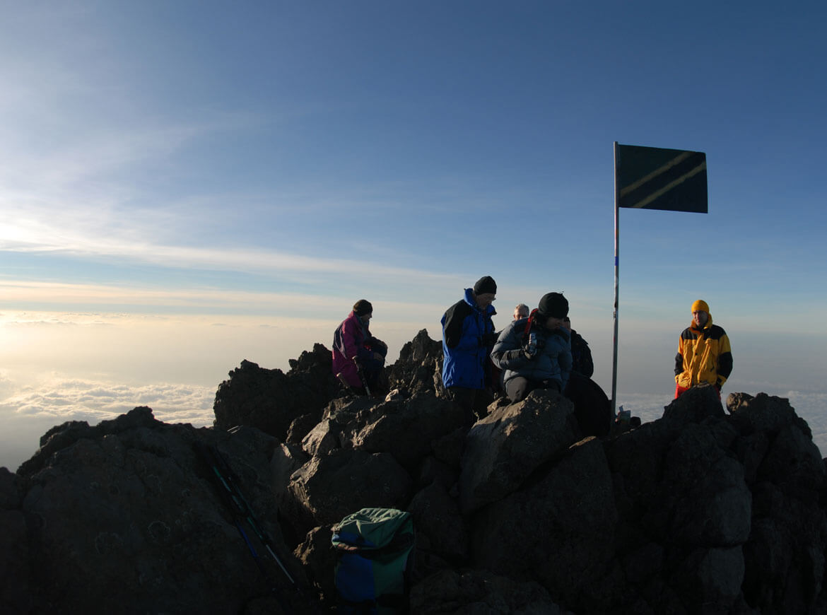 Kilimanjaro, 5.894 M / Das „Dach Afrikas“ erhebt sich schon von Weitem sichtbar aus der Steppe. Der Anstieg führt durch alle Vegetationszonen hinauf zum kargen Gipfelbereich des ehemaligen Vulkans. Die Besteigung fordert zwar kein großes alpintechnisches Können, darf aber aufgrund der Höhenlage nicht unterschätzt werden. Darum ist es wichtig, sich bereits am Mt. Meru etwas anzupassen, um die notwendige Akklimatisation zu unterstützen. Der Gipfelsturm beginnt kurz nach Mitternacht, über steilen Lavaschutt geht es hoch bis an den Rand des Kraters, dem Gillmans Point, von dort flacher zum eigentlichen Hauptgipfel. Wiederum genießt man einen herrlichen Ausblick diesmal vom höchsten Punkt des Kontinents.