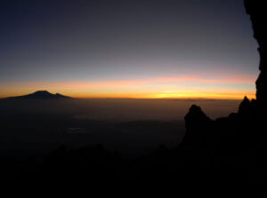Mt. Meru, 4.568 M / Das Mt. Meru-Massiv ist wie auch der Kibo vulkanischen Ursprungs. Durch die ständige Erosion wurde das lockere Gestein abgetragen und übrig blieb ein Gebilde aus Zapfen und Pfeilern aus einem einzigartigen Gestein. Bis zur Saddle Hut führt ein guter Weg. Zum Gipfelgang wird bereits im Dunkeln mit Stirnlampe aufgebrochen. Für den Aufstieg ist gute Trittsicherheit notwendig, kurze Passagen erfordern leichte „Kletterei“ im ersten Schwierigkeitsgrad. Der felsige Gipfel bietet einen tollen Eindruck vom gegenüberliegenden Kilimandjaro und der beeindruckenden Steppenlandschaft im Westen. Begleitet werden Sie hier zusätzlich von einem bewaffneten Parkranger.