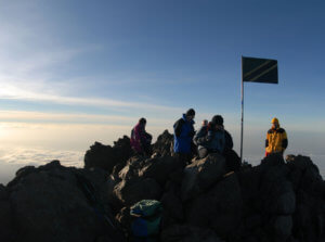 Tag 11: Mit ein bißchen Glück stehen wir bereits am Gillman’s Point (5690 M), wenn die Sonne sich aus der Steppe erhebt. Noch eine gute Stunde, und wir erreichen den Uhuru Peak (5895 M), das „Dach Afrikas“. Der Abstieg führt uns über die klassische Maranguroute zur Horombo Hütte (3720 M). 1200 HM