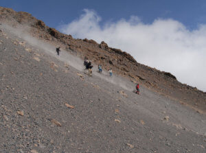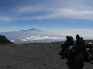 Tag 10: Über den zweiten Sattel zwischen Kibo und Mawenzi erreichen wir die Kibo Hut (4703 M). Schon bald wird in die Schlafsäcke gekrochen, morgen heißt es früh aufstehen!