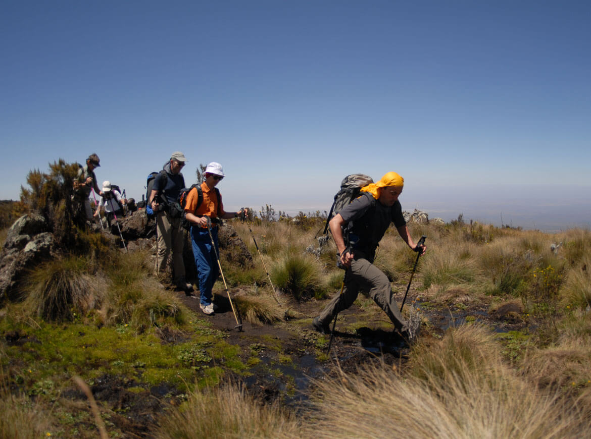 Tag 8: Steil durch den Wald hinauf erreichen wir die Moorland Zone in Richtung Mawenzi. Das Lager (3600 M) liegt bei den Kikelewa Höhlen. Gehzeit zirka 4 bis 5 stunden.